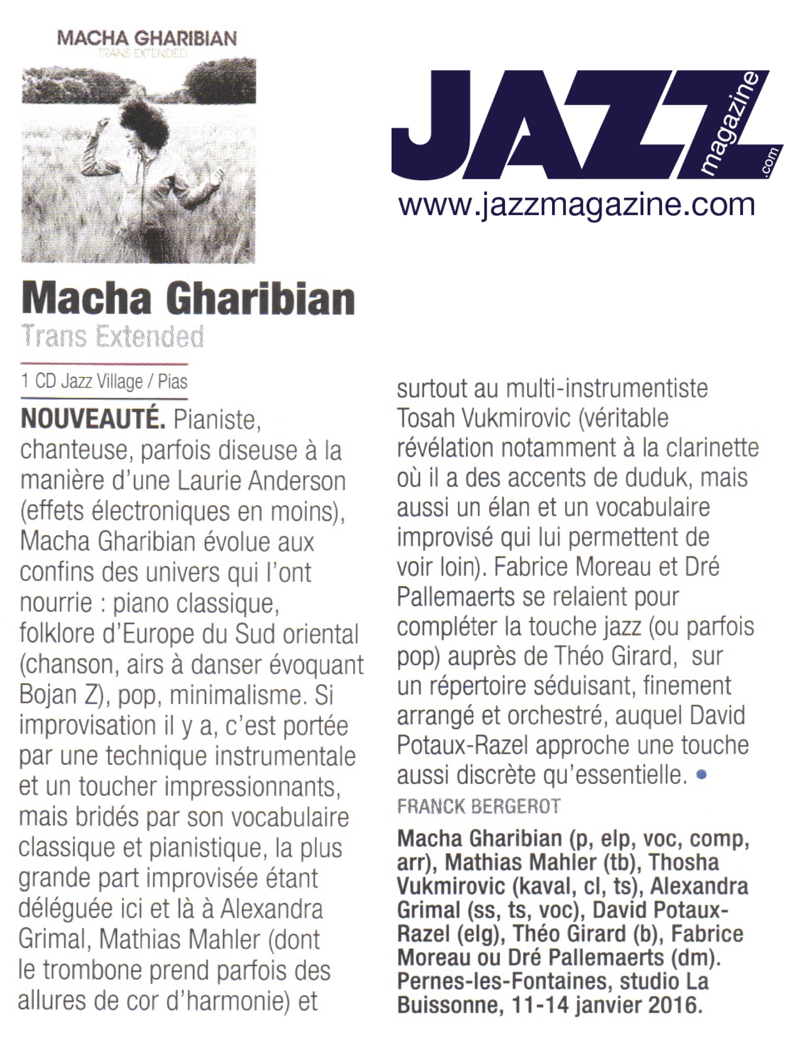 Following on from her first record Mars (2013), which grabbed the attention of both music lovers and critics, Macha Gharibian’s album Trans Extended places her music in the unclassifiable category, given her very personal style combining elements of oriental jazz with neo-classical and adventurous pop music. A bold composer, she carves out heavenly melodies. An ethereal pianist and vigorous singer, she turns them into intense, spell-binding pieces.